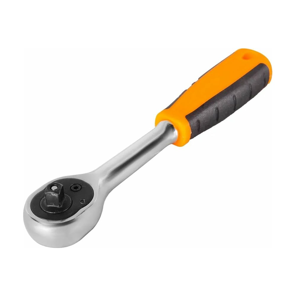 Трещотка предназначена для быстрого и эффективного закручивания или откручивания крепежа. Инструментом удобно пользоваться в условиях ограниченного пространства, когда нет возможности выполнить полный оборот вокруг гайки. Используется в быту и при авторемонте.Особенности:Рабочая часть изготовлена из CrV стали и обладает особой прочностью.Хромированное покрытие надёжно защищает трещотку от коррозии.Трещотка снабжена механизмом быстрого сброса насадок, что ускоряет процесс работы.Двухкомпонентная рукоятка не выскальзывает из ладони.Трещоточный 72-зубцовый механизм обеспечивает плавность хода, а малый угол поворота в 5° позволяет работать в ограниченном пространстве.Наличие в трещотке храпового механизма обеспечивает быструю смену направления вращения и упрощает работу в труднодоступных местах.
