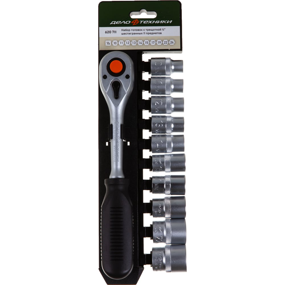 Набор шестигранных головок с трещоткой 1/2 11 предметов ДТ/12 Дело Техники 620711 изготовлен из хромванадиевой стали. Повышенная твердость достигается благодаря процессу холодной ковки с последующей термообработкой. Инструменты используется для монтажа и демонтажа резьбовых соединений. Трещотка обеспечивает дополнительный комфорт в работе, так как можно не перехватывать руку во время закручивания. Пластиковый держатель способствует компактному хранению приспособлений.