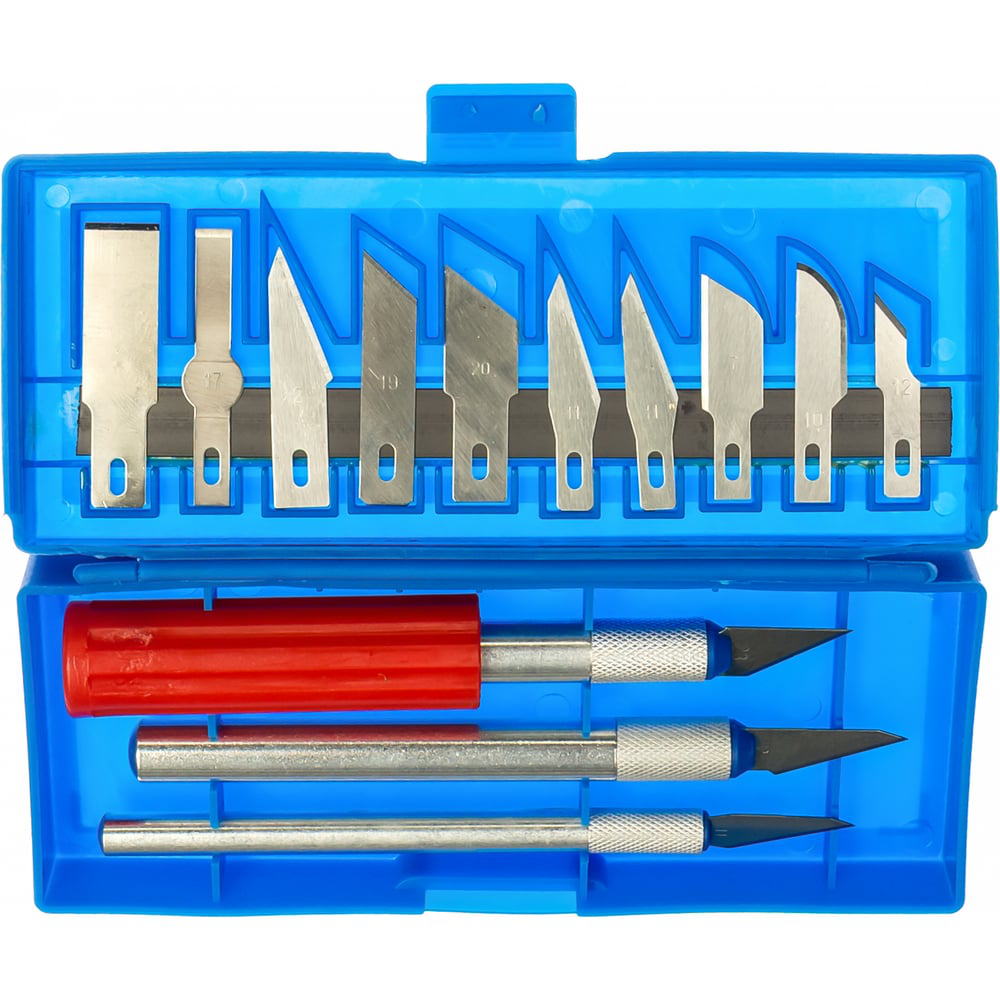 Набор резаков по дереву FIT DIY 13 шт 43424 подойдет для проведения различных художественных работ, вырезания по картону, мягким породам дерева или для обрезки линолеума. В комплекте идет 3 ножа и 10 лезвий, которые при желании можно поменять, раскрутив верхнюю часть. Набор поставляется в компактном пластиковом кейсе.