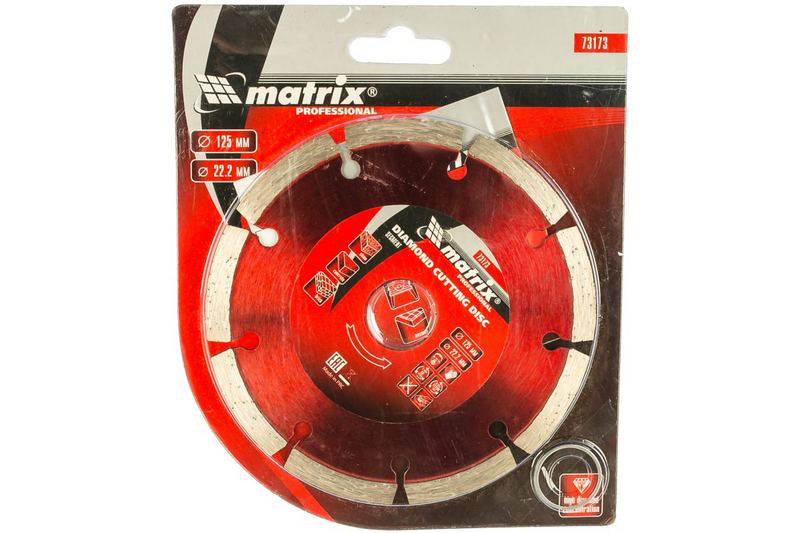 Диск алмазный отрезной сегментный, 125 х 22,2 мм, сухая резка// MATRIX Professional - это профессиональный инструмент, предназначенный для точной и эффективной резки различных материалов. Диск имеет диаметр 125 мм и отверстие под шпиндель 22,2 мм, что позволяет использовать его с большинством угловых шлифовальных машин.Сегментный дизайн диска обеспечивает высокую прочность и долговечность, позволяя справиться с самыми трудными задачами резки. Он оснащен алмазными зернами, которые обеспечивают быструю и чистую резку без застревания или заедания.