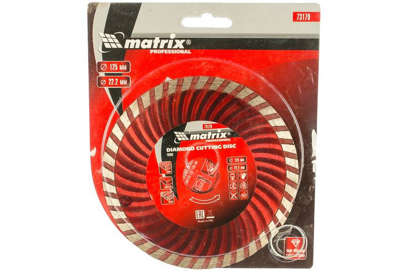 Продукт производится компанией MATRIX Professional, которая известна своими высококачественными инструментами. Диск алмазный отрезной Turbo, 125 х 22,2 мм, сухая резка от MATRIX Professional 73179 является надежным и долговечным инструментом, который поможет вам справиться с любыми задачами по резке материалов.