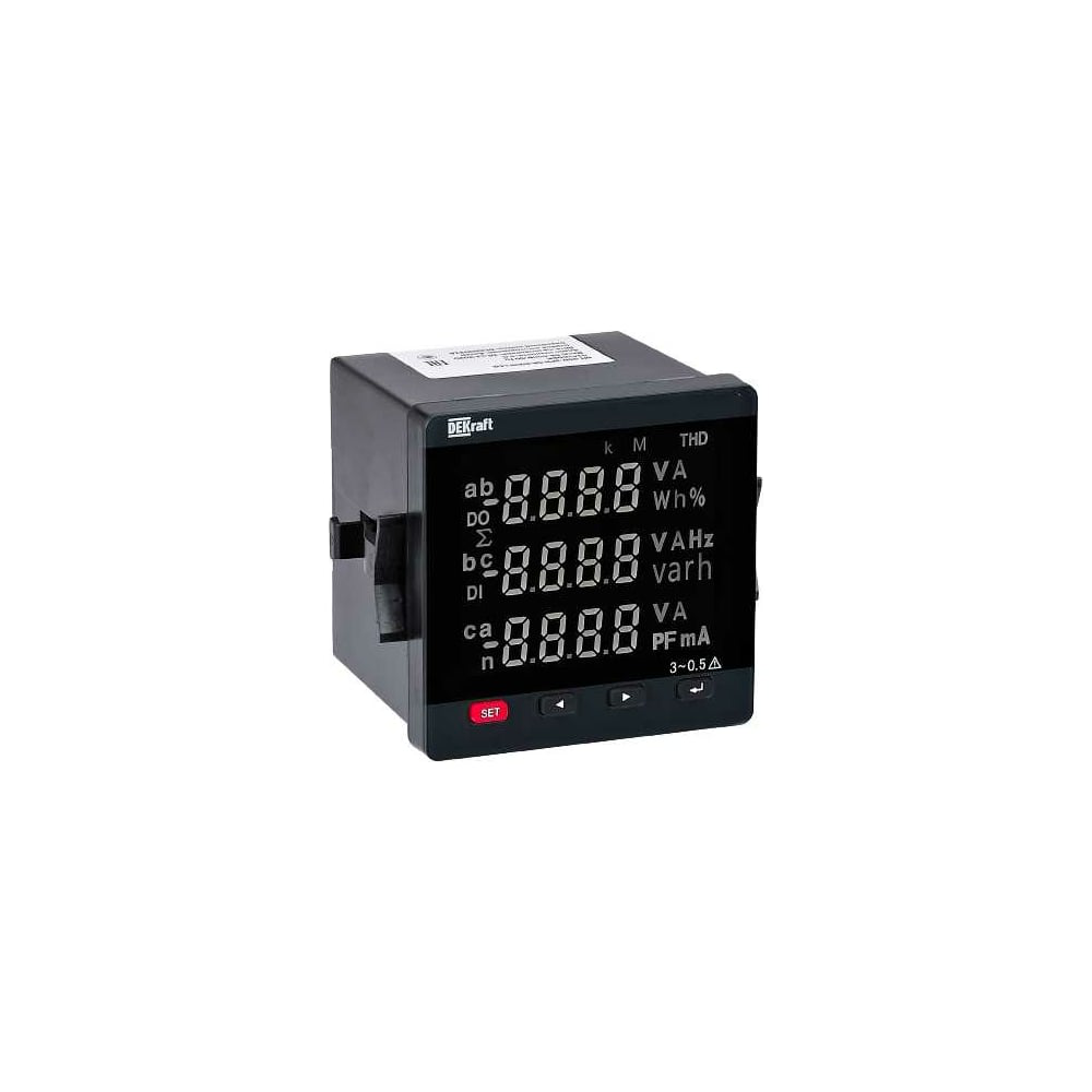 Цифровой мультиметр DEKraft мт-72d 72x72мм, трехфазный, вход 600в 5а, rs485, lcd-дисплей 51412DEK предназначен для измерения электрических величин в цепях переменного тока частотой 50 Гц. В этой серии измерительных приборов модульной конструкции используется технология дискретизации переменного тока и цифровой обработки сигналов. Прибор удобен в установке, подключении и обслуживании. Он может быть запрограммирован для установки параметров на месте, реализуя сеть различных ПЛК и компьютерных коммуникационных программ в промышленности. Тип сети: Однофазная, трехфазная Перенапряжение: Постоянное: 1.2×Un; Пиковое: 2×Un в течение 1с Перегрузка по току: Постоянная: 1.2×In; Пиковая: 10×In в течение 5с Характеристики контактов: 3A/250В AC; Настраиваемые значения: Значения максимального, минимального значения срабатывания и значения гистерезиса Способ вывода: Переключающий контакт или сигнализация Интерфейс связи: RS485 Протокол связи: MODBUS-RTU Скорость передачи: 1200, 2400, 4800, 9600 бод Бит четности: Чет, нечет, нет Потребляемая мощность:< 5ВА Вход и вспомогательное питание: >2кВ 50 Гц / 1 мин Вход и выход: >2кВ 50 Гц / 1 мин Выход и вспомогательное питание: >2кВ 50 Гц / 1 мин Сопротивление изоляции: Между входами, выходами и корпусом прибора >100 МОм