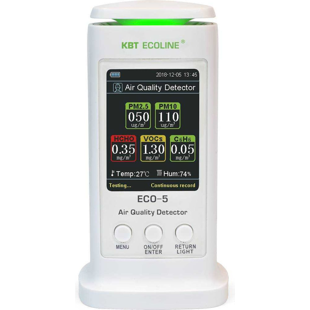 Анализатор воздуха КВТ ECO-5 ECOLINE 79140 используется для определения содержания мелкодисперсной пыли, углекислого газа и летучих органических веществ в воздухе. Дополнительно прибор измеряет влажность и температуру воздуха. Большой дисплей с подсветкой облегчает использование устройства в темных условиях. Постоянный мониторинг состояния воздуха помогает в кратчайшие сроки обнаружить отклонения от нормы.