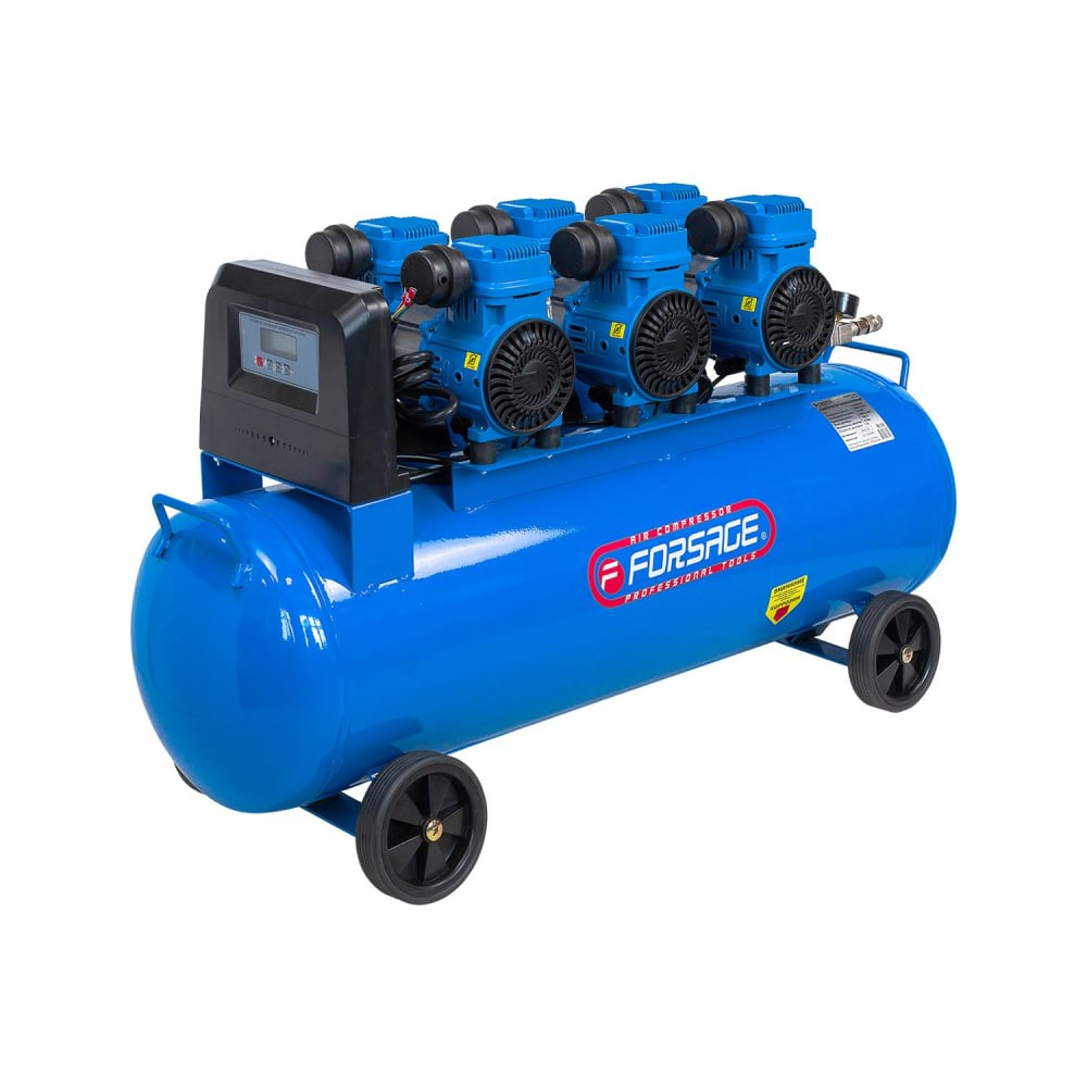 Компрессор поршневой безмасляный от бренда Forsage - электромеханический инструмент, предназначенный для получения сжатого воздуха. Продуманность конструкции. Надежную работу обеспечивают прямой привод, механический предохранитель клапана высокого давления и выключатель давления. Компрессор оснащен шестицилиндровым двигателем, а также манометром для регулировки давления. Компрессор работает в безмасляном режиме, что позволяет применять аппарат без специального оборудования для очистки воздуха от масла. Модель оснащена защитой от перегрузок, что увеличивает срок службы компрессора. При необходимости можно напрямую подключать второй накопитель или пневмомагистраль через дополнительный порт. Удобство использования. Благодаря наличию колес, передвижной компрессор легко использовать на даче для продувки труб водоснабжения перед зимой, или даже дома для продувки водопровода. Технические характеристики: Мощность двигателя 3300 Вт; Напряжение сети 230 В; Частота тока 50 Гц; Производительность 630 л / мин; Давление максимальное: 8 бар; Уровень шума 70дБ; Ресивер 100 литров. Количество цилиндров 6 Внимание! Вилка питания в комплектацию не входит.