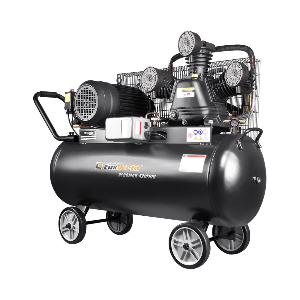 Ременной компрессор Foxweld AEROMAX 420/100 5074 с высокой производительностью в 420 литров в минуту и вместительным ресивером на 100 литров. Ременная передача закрыта решеткой, предотвращающей её повреждение, а также травмирование пользователя в случае обрыва ремня. Большой объем ресивера сокращает частоту отключений компрессора при падении давления до минимального значения. Четыре колеса и удобная высокая ручка гарантируют простоту перемещения устройства. Указатель уровня масла в системе позволяет своевременно проводить обслуживание агрегата. Наличие манометра обеспечивает удобный контроль давления в системе, а аварийный выключатель красного цвета позволяет оперативно остановить работу ременного компрессора в случае неисправности. Подходит для плазменной резки и для оборудования требующего большого расхода воздуха. Агрегат также может эффективно эксплуатироваться в строительстве и в сфере шиномонтажа.