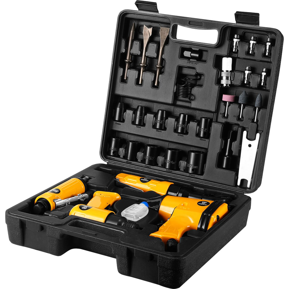 Набор пневмоинструмента DEKO Premium 34 предмета 018-0908 представляет собой универсальный набор. Включает четыре инструментаи аксессуары к ним. Поставляется в прочном кейсе, который надежно защищает содержимое при транспортировке. Пневматическая шлифовальная машина Число оборотов, об/мин: 22000 Размер цанги, мм: 3, 6 Расход воздуха, литры/мин: 113 Диаметр воздушного штуцера, дюйм: 1/4” Тип соединения: Резьбовое Давление, атм: 6 Пневматический гайковёрт Число оборотов, об/мин:7000 Расход воздуха, литры/мин: 204 Размер крепежа, дюйм: 1/2” Максимальный крутящ. момент, Нм: 569 Давление, атм: 6 Диаметр воздушного штуцера, дюйм: 1/4” Пневматическая трещотка Число оборотов, об/мин: 160 Расход воздуха, литры/мин: 113 Размер крепежа, дюйм: 3/8” 1/2” Максимальный крутящ. момент, Нм: 81 Тип соединения: Резьбовое Давление, атм: 6 Диаметр воздушного штуцера, дюйм: 1/4” Пневмодолото Частота ударов, уд/мин: 4500 Расход воздуха, литры/мин: 141 Размер хвостовика, мм: 10.2mm Выпуск воздуха: передний Давление, атм: 6 Диаметр воздушного штуцера, дюйм: 1/4”