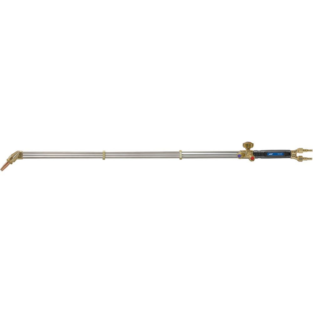 Резак ПТК Р3-300ВУ универсальный, L-1100 мм, угол головки 135 гр. 00000033781 используется для резки и раскроя металлических конструкций из низкоуглеродистых сталей. Максимальная толщина реза зависит от выбранного мундштука и может достигать 300 мм. В комплект входит разборный пропановый мундштук №2РМ. В таком исполнении данная модель может разрезать металл толщиной 15-30 мм. Дополнительные характеристики: Давление кислорода на входе, МПА (кгс/см²): 2,5–10 Давление пропана на входе, МПА (кгс/см²): 0,4–1,5 Давление ацетилена на входе, МПА (кгс/см²): 0,30–0,50 Расход кислорода, м³/ч: 4–33,2 Расход пропана, м³/ч: 0,41–0,86 Расход ацетилена, м³/ч 0,025–1,5 Угол наклона головки резака:135°.