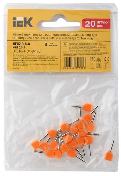 Наконечник штыревой втулочный предназаначен для оконцевания опрессовкой проводов с медными жилами в электрических цепях переменного и постоянного тока. Рассчитан для монтажа и подключения двух проводников.