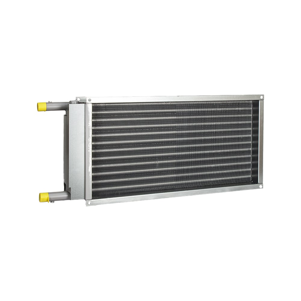 Конструкция водяного нагревателя позволяет обеспечить как прямоточную (направление движения воздуха и энергоносителя совпадают), так и противоточную (направление движения воздуха и энергоносителя противоположны) схемы подключения воды. Теплообменник состоит рядов медных трубок с внешним диаметром 12 мм, оребрённых теплообменными элементами в виде гофрированных пластин из алюминиевой фольги. Трубки объединены в группы, концы которых впаяны в коллекторы из стальных или медных труб, через которые осуществляется вход и выход теплоносителя или хладагента. Типоразмер фронтальных сечений ВОП соответствует сечению существующих воздуховодов. Присоединительные размеры соответствуют присоединительным размерам элементов канальной вентиляции , что позволяет применять их для встраивания в существующие системы вентиляции или для замены импортных канальных воздухонагревателей. Для соединения с внешней системой на коллекторах имеются специальные патрубки, обеспечивающие сварное, резьбовое или фланцевое соединение. Нагрев или охлаждение воздуха происходит при его прохождении через теплообменник в процессе взаимодействия с медными трубками и алюминиевыми пластинами.