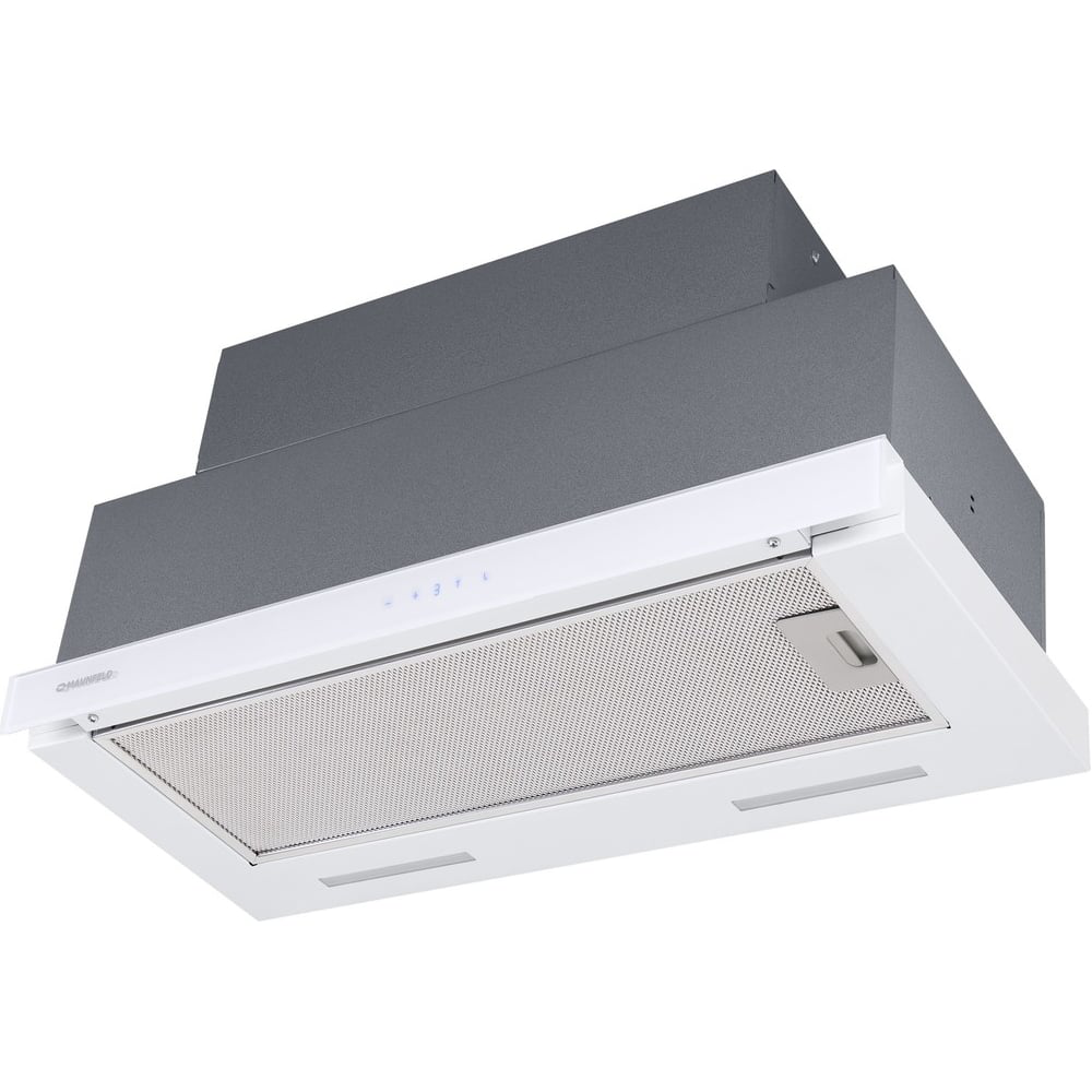 Сверхмощная телескопическая кухонная вытяжка с шириной 60 см благодаря выдвижному козырьку может эффективно очищать загрязненный воздух на в кухне очень большой площади (до 50 кв.м). Модель встраивается в навесной шкаф над поверхностью плиты. Работает в 2-х режимах – отвода (при подключении к системе вентиляции) и рециркуляции (при использовании сменного угольного фильтра). Фасад выдвижной панели выполнен из закаленного глянцевого стекла белого цвета. Основная рабочая и выдвижная панели изготовлены из нержавеющей стали с эмалированным белым покрытием. Установлено два жироулавливающих фильтра из алюминия. Корпус сделан из нержавеющей стали. Дисплей сенсорного управления находится по центру фасада. Вы можете выбрать одну из 4-х скоростей работы вентилятора, выставить таймер и включить освещение, состоящее из 2 мощных LED-источников по 3 Вт каждый. Мотор мощностью 260 Вт с максимальной производительностью 1050 м3/ч. При работе даже в самом интенсивном режиме уровень шума не превышает 48 дБ. Воздуховод диаметром 120 мм и обратным клапаном не позволяет загрязненному воздуху попадать обратно в вашу кухню.
