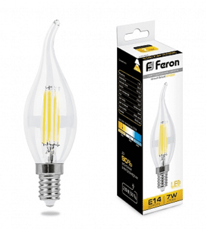 Лампа светодиодная филамент FERON LB-67, C35T (свеча на ветру), 7W 230V E14 2700К (белый теплый), рассеиватель прозрачный 740Lm, угол рассеивания 270°, корпус стекло, 121*35мм