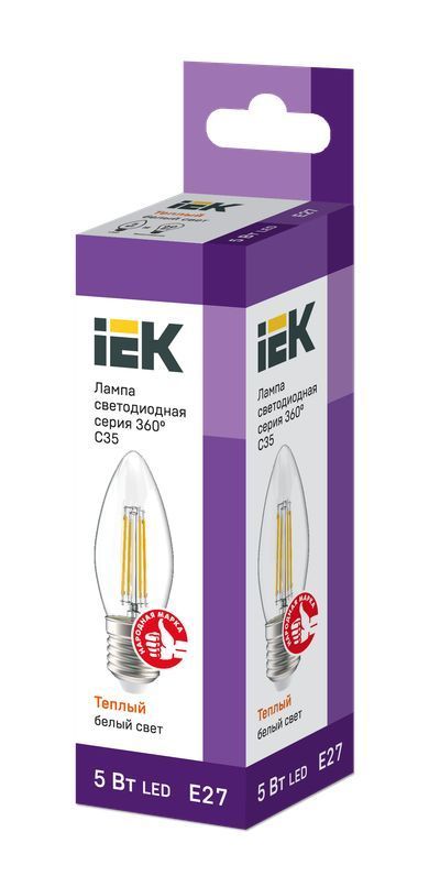 Лампа LED C35 свеча прозр. 5Вт 230В 3000К E27 серия 360° IEK с нитевидным светодиодом (филаментная нить) является одним из самых эффективных источников света. Главное отличие от обычных светодиодных ламп – угол рассеивания света до 360° (дополнительный комфорт для глаз). Лампа применяется в осветительных приборах бытового назначения. Представлены в 3 вариантах: с прозрачной, золоченой и матовой колбами. Соответствуют требованиям Технических регламентов Таможенного союза ТР ТС 004/2011, ТР ТС 020/2011, МЭК 62560 и постановления Правительства РФ от 10.11.2017 № 1356.