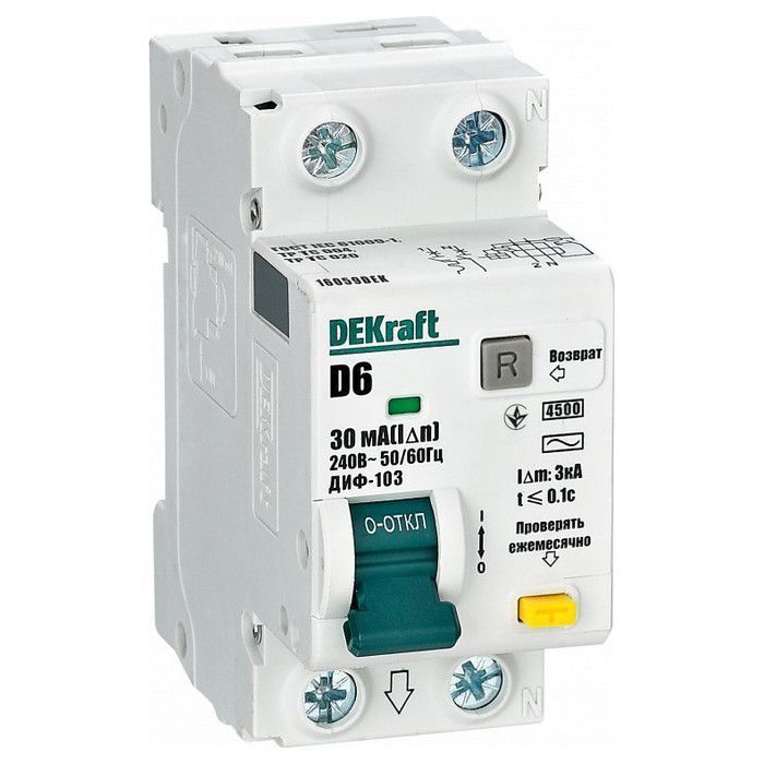 Дифавтомат DEKraft ДИФ-103 1P+N 6А (D) 4.5 кА, 30 мА (AC), 16059DEK - это электрическое устройство, предназначенное для защиты электрических цепей от перегрузок и коротких замыканий. Он имеет одну полюсную и одну нулевую полюсную защиту, что позволяет обеспечить безопасность и надежность работы электропроводки.Дифавтомат имеет номинальный ток 6А и номинальное напряжение 230В, что позволяет использовать его в бытовых и коммерческих помещениях. Он обладает дифференциальной чувствительностью 30 мА, что позволяет обнаруживать даже небольшие утечки тока и предотвращать возможные аварийные ситуации.