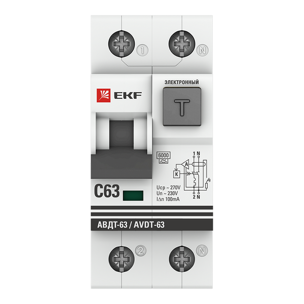 ОБНОВЛЕНИЕ ЛИНЕЙКИ PROXIMA Артикул аналог: D63N26EA63C100 Автоматический выключатель дифференциального тока АВДТ-63 EKF PROxima представляет аппарат, сочетающий функции автоматического выключателя с электромеханическим или электронным УЗО. При обнаружении автоматическим выключателем в защищаемом участке сети тока утечки (повреждения) на землю или сверхтока (тока перегрузки или короткого замыкания) происходит срабатывание устройства, приводящее к отключению защищаемой сети. Возможна коммутация алюминиевым и медным проводником. Автоматический выключатель дифференциального тока малогабаритный АВДТ-63М EKF PROxima представляет аппарат, сочетающий функции автоматического выключателя с электронным УЗО типа АС в компактном корпусе шириной один модуль. При обнаружении автоматическим выключателем на защищаемом участке сети тока утечки (повреждения) на землю или сверхтока (тока перегрузки или короткого замыкания) происходит срабатывание устройства, приводящее к отключению защищаемой сети. Особое отличие дифференциальных автоматических выключателей EKF с электронным УЗО – в наличии блока защиты от перенапряжения. Возможна коммутация алюминиевым и медным проводом.