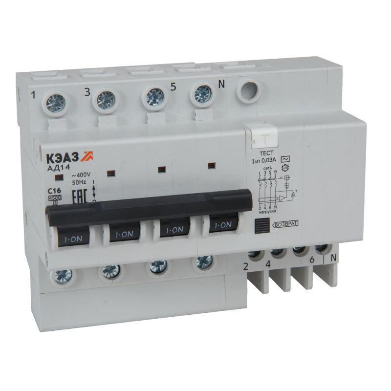 Автоматический выключатель дифференциального тока на номинальный ток 25 А и номинальный отключающий дифференциальный ток 30 мА.