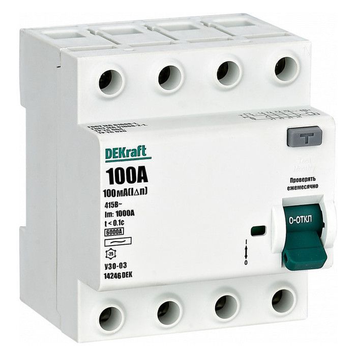 УЗО DEKraft УЗО-03 4P 100А 6 кА, 100 мА (AC), 14246DEK - это четырехполюсное устройство защитного отключения, предназначенное для обеспечения безопасности электрических сетей и оборудования.Данное УЗО имеет номинальный ток 100А и предельную отключающую способность 6 кА. Три полюса предназначены для фазных проводов, а четвертый полюс - для нулевого провода.