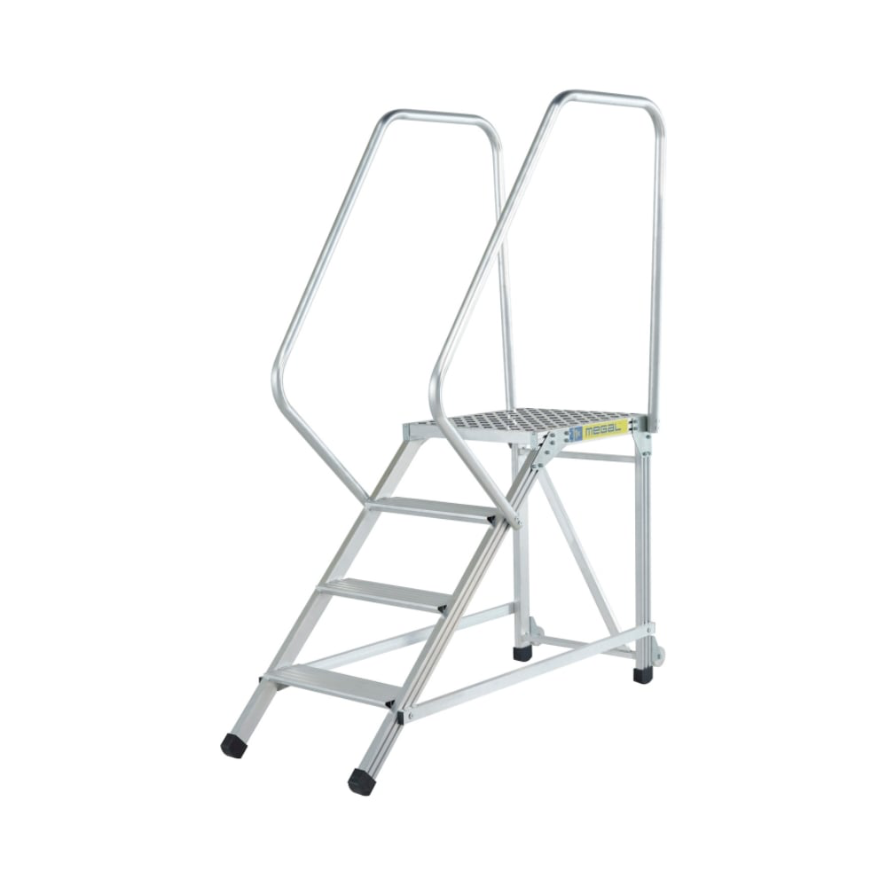 Лестница-подмости с двумя поручнями MEGAL ЛП-0.6 051802 предназначена для обеспечения комфортных условий труда при выполнении монтажных, сервисных и других работ на небольших высотах. Сверху подмости укомплектованы двумя поручнями, снизу – резиновыми противоскользящими башмаками. Для удобства перемещения по рабочей территории модель оснащена комплектом колес. Широкие ступени глубиной 16 см из специального рифленого профиля обеспечивают безопасный подъем и комфорт в работе. Верхняя площадка имеет размер 60х70 см. Наклонный лестничный маршрут расположен под углом 45 градусов. Обратите внимание! Количество ступеней не соответствует представленному на фото.
